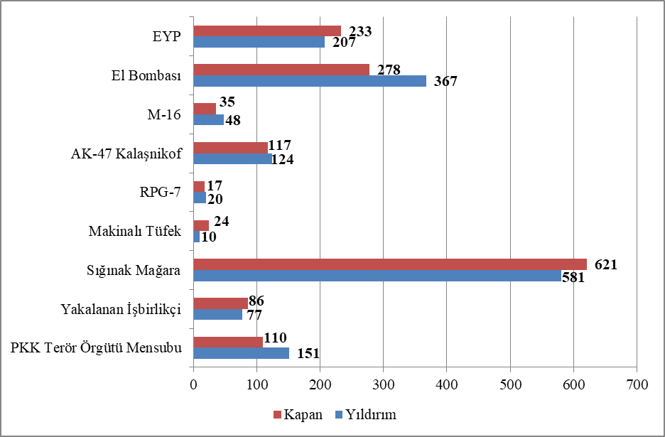 Sonuç olarak Kapan ve Yıldırım operasyonlarında toplamda; 261 PKK terör örgütü mensubu etkisiz hale getirilmiş, 163 işbirlikçi yakalanmıştır. Operasyonlarda 1.202 sığınak ve mağara imha edilmiş; 1 adet havan, 34 adet makinalı tüfek, 37 adet RPG-7 tanksavar silahı, 241 adet AK-47 ve 83 adet M-16 piyade tüfeği, 645 el bombası ele geçirilmiştir. Operasyonlarda 440 el yapımı patlayıcı imha edilmiş, 7.260 kg patlayıcı madde ve 165.738 adet çeşitli çapta mühimmat ele geçirilmiştir (Tablo 1).
