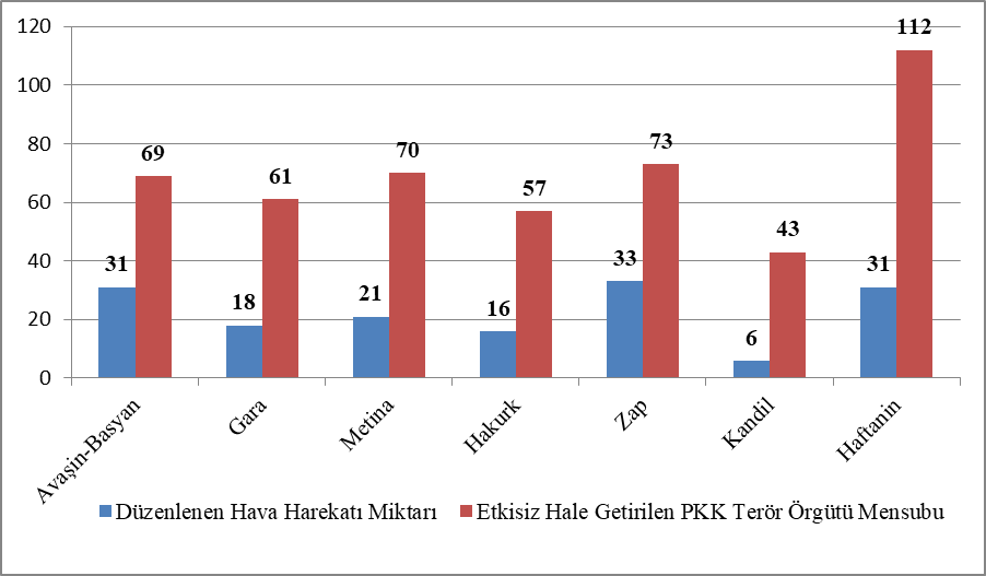 Yine Milli Savunma Bakanlığı Twitter hesabında duyurulan bilgilere göre; 2020 yılı içerinde, Irak’ın kuzeyindeki PKK terör örgütü barınma alanlarından; Avaşin Basyan’a 31, Gara’ya 18, Metina’ya 21, Hakurk’a 16, Zap’a 33, Kandil’e 6, Haftanin’e 31 ayrı hava harekâtı olmak üzere toplam 156 hava harekâtı düzenlenmiştir. Düzenlenen 156 hava harekâtında toplam 485 terör örgütü mensubu etkisiz hale getirilmiştir (Tablo 5). Yıl içerisinde ayrıca Irak’ın kuzeyinden PKK terör örgütünden kaçan 23 terörist Silopi’de teslim olmuştur. Yine Milli Savunma Bakanlığınca Fetullahçı Terör Örgütü FETÖ ile mücadele kapsamında 15 Temmuz 2016’dan bugüne toplam 20.833 personelin ilişiğinin kesildiği açıklanmıştır.