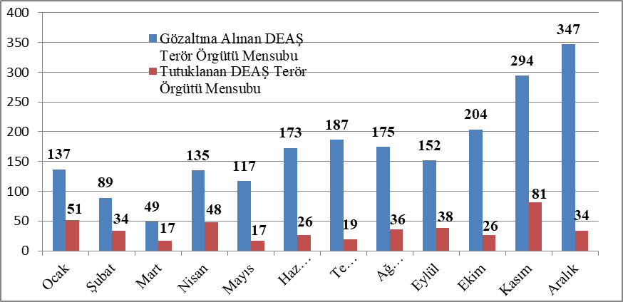 DEAŞ terör örgütüyle mücadelede yurtiçinde düzenlenen operasyonlarda toplam 2.059 kişinin gözaltına alındığı, bu kişilerin 427’sini[3] ise tutuklandığı görülmektedir (Tablo 6).