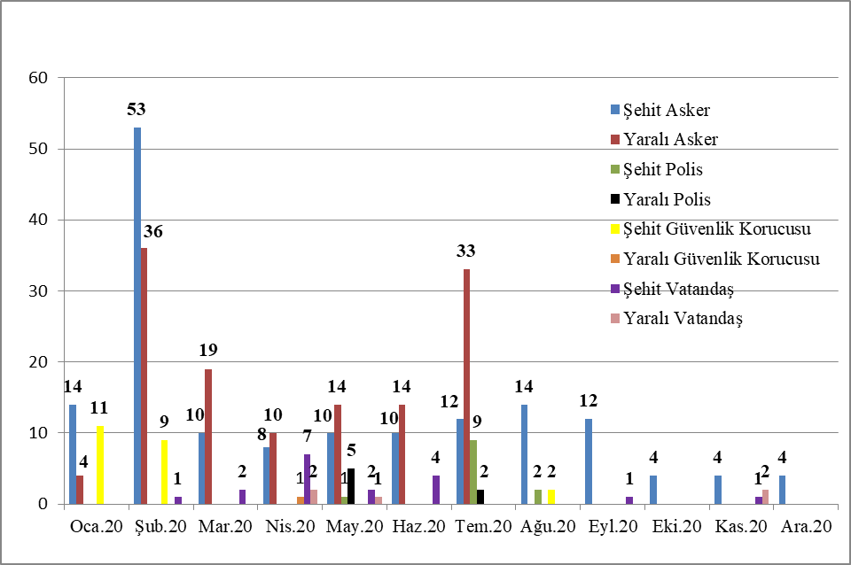 Açık kaynaklardan elde edilen verilere göre 2020 yılında 155 askerimiz, 12 polisimiz, 22 güvenlik korucumuz ile 18 vatandaşımız şehit olmuştur (Tablo 7).