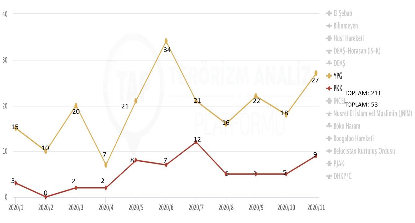 2020 yılı terör saldırı miktarları verilerine[5] göre; yılın 11 ayında PKK tarafından toplam 58, PYD tarafından ise 211 terör saldırısı düzenlendiği görülmektedir (Tablo 9). PKK terör örgütünün aylık terör eylemi ortalamasının yaklaşık 5 eylem, PYD’nin ise yaklaşık 19 olması, Suriye kuzeyindeki eylem sayısının Türkiye’ye oranla yaklaşık 4 kat daha fazla olduğunu ortaya koymaktadır. PKK terör örgütünün günümüzdeki önceliği Suriye kuzeyindeki varlığını meşrulaştırmak, bu bölgede özerk bir yönetim ilan etmektir. Türkiye'de PKK terör örgütüyle mücadelede görülen olumlu gelişmelerle birlikte Suriye'de PKK'nın eleman sayısının sürekli olarak arttığı da gözden kaçırılmamalıdır. Suriye'de gerek zorla PKK terör örgütüne katılan, gerek kendi isteği ile katılan, gerekse Türkiye ve Irak'tan aktarılan terör örgütü elemanlarının sayısının onbinlerle ifade edildiği, esas tehdidin Suriye'ye kaydığı, tehdide yönelik tedbirlerin de bu yönde alınması gerektiği değerlendirilmektedir. Türkiye'de sonu gelen PKK'nın ardından Suriye'de PKK ile mücadele güvenlik gündeminin en ön sıralardaki yerini korumalıdır.