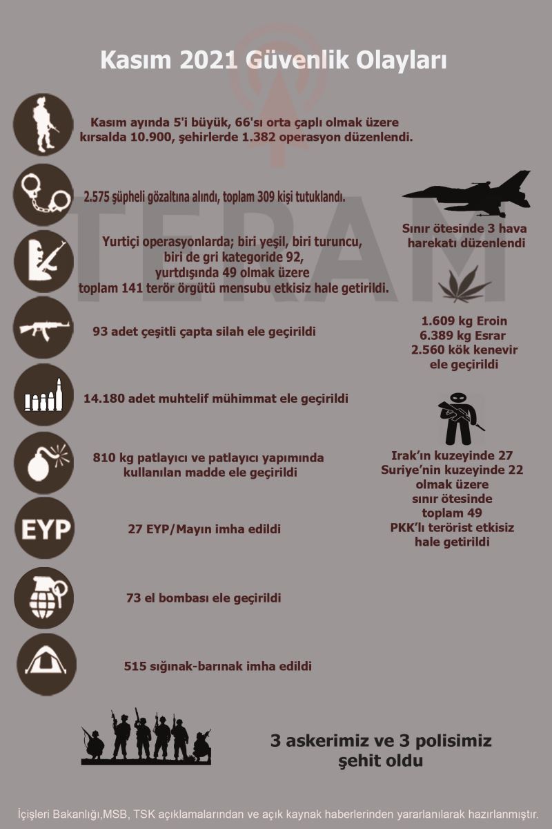 11. Kasım ayında yurtiçi ve dışında toplam 119 terörist etkisiz hale getirilmiştir.