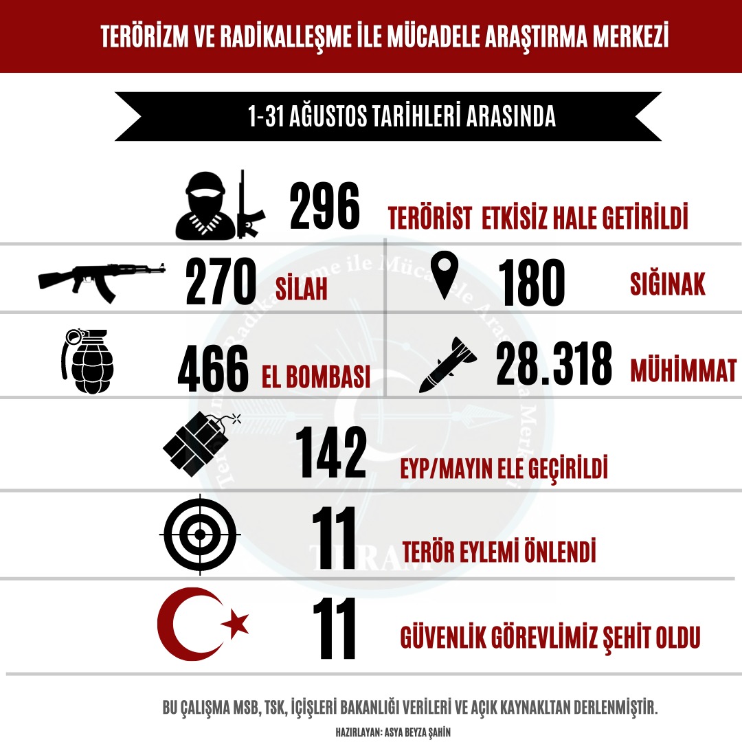 2. Yurtiçi operasyonlarda 5’i liste dışı, 2’si gri, 4’ü turuncu ve 2’si yeşil kategoride aranan teröristlerin de bulunduğu 16’sı ölü, 60’ı sağ, 14’ü teslim toplam 90 terörist etkisiz hale getirildi. Sınır ötesinde ise; Suriye’nin kuzeyinde 139, Irak’ın kuzeyinde 67 olmak üzere yurt dışında toplam 206 PKK terör örgütü mensubu etkisiz hale getirildi. Ağustos ayında yurtiçi ve yurtdışında toplam 296 terör örgütü mensubu etkisiz hale getirildi.