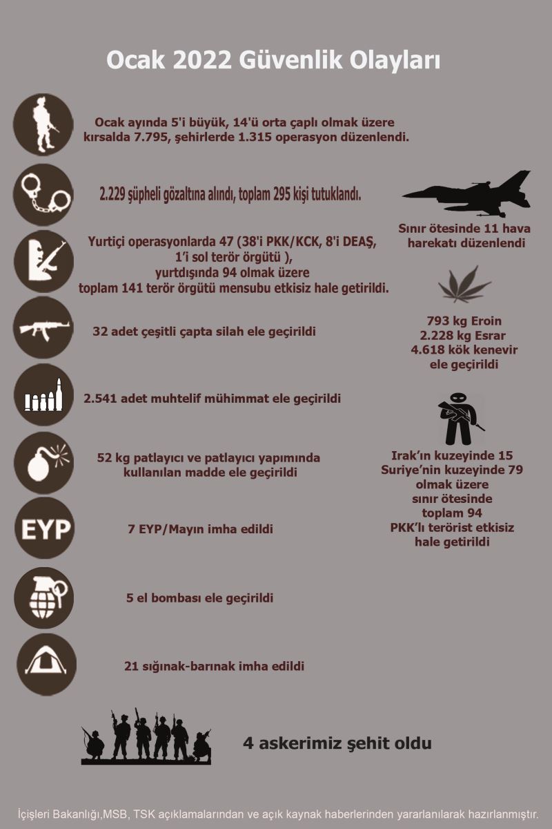 1. Ocak ayında kırsal alanda 5’i büyük, 14’ü orta çaplı olmak üzere toplam 7.795, şehirlerde 1.315 operasyon düzenlendi.