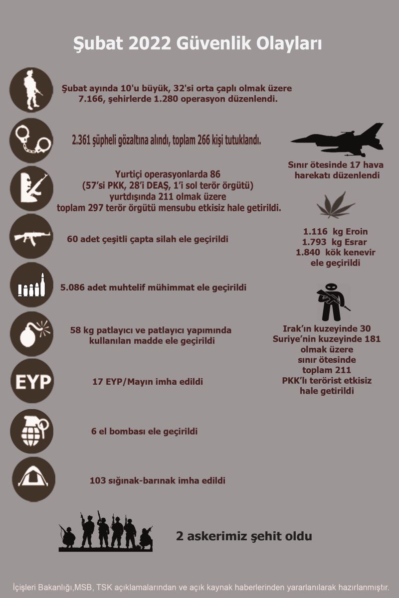 1. Şubat ayında kırsal alanda 10'u büyük, 32'si orta çaplı olmak üzere 7.166, şehirlerde 1.280 operasyon düzenlendi.