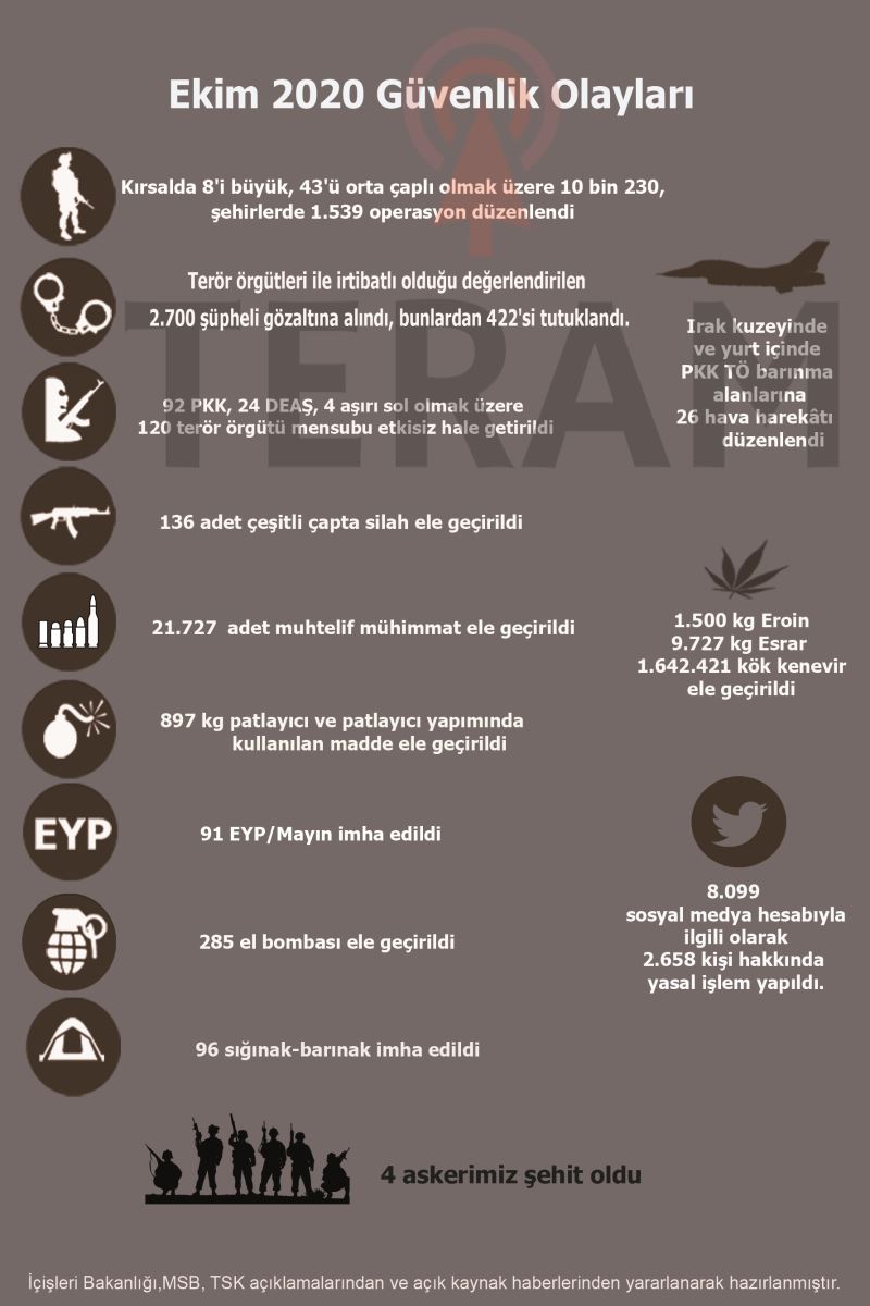 1. Ekim ayında iç güvenlik operasyonları kapsamında, kırsal alanda 8'i büyük, 43'ü orta çaplı olmak üzere 10 bin 230, şehirlerde 1539 operasyon yapıldı.