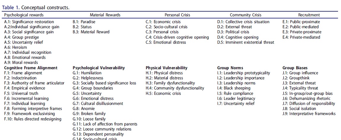 [44] Çoğu aşırılık yanlısı şiddet kullanımının ideolojik gerekçelerini öne sürerken, biz ideolojiyi iki nedenden ötürü analizimize kavramsal bir yapı olarak dahil etmemeyi seçtik. Birincisi, bu çalışmaya dahil edilen kişilerin tamamı şiddeti meşrulaştıran ideolojileri ifade ederken, yaklaşık yarısı şiddet eylemlerine katılmamıştır. Dolayısıyla, inançlar davranışlardaki çeşitliliği açıklayamaz. İkincisi, ideoloji daha önceki modellere nedensel bir yapı olarak dahil edildiğinde, analizin genel karmaşıklığını artırdı, ancak önemli ölçüde farklı sonuçlar üretmedi.
