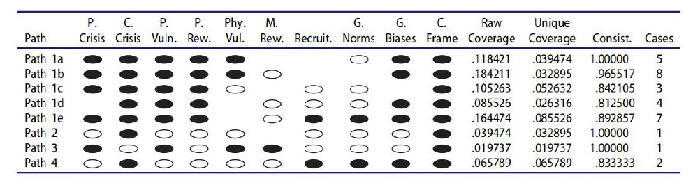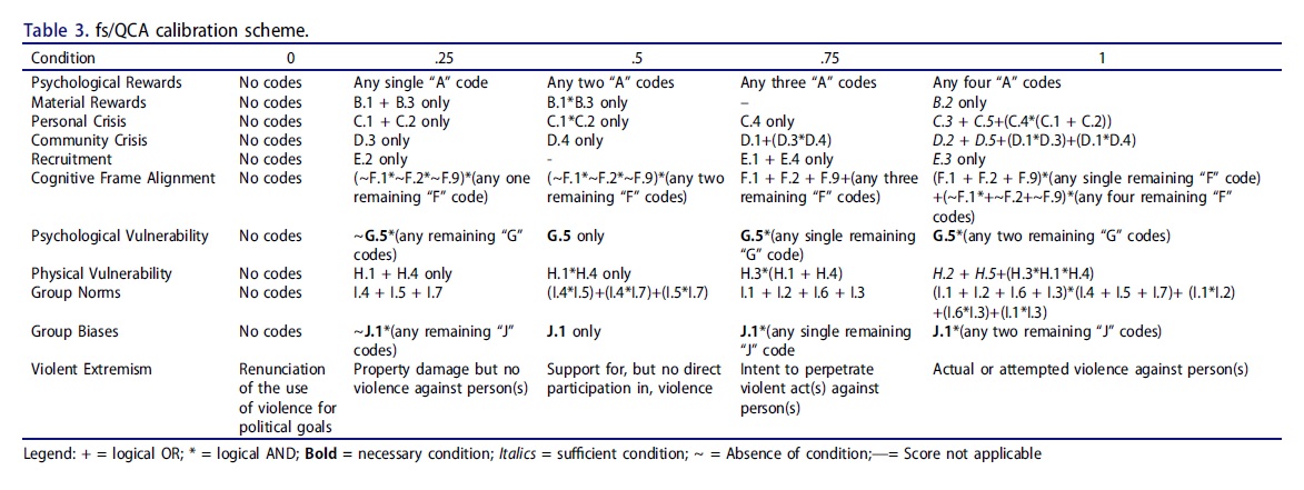[93] Ragin'in tavsiyesini takiben, gerekli koşullarımızdan birini - bilişsel çerçeve hizalaması - yeterlilik testlerinden çıkardık ve analizler için 9 nedensel yapı bıraktık. Diğer gerekli koşulumuz olan topluluk krizi, sonucun mevcut olduğu ancak koşulun olmadığı durumlar olduğu için muhafaza edildi. Benoit Rihoux ve Charles Ragin (Thousand Oaks, CA: Sage, 2009) tarafından düzenlenen Yapılandırmalı Karşılaştırmalı Yöntemler: Nitel Karşılaştırmalı Analiz (QCA) ve İlgili Teknikler bölümünde Charles Ragin, "Bulanık Kümeleri Kullanarak Niteliksel Karşılaştırmalı Analiz (fsQCA)" bölümüne bakınız.