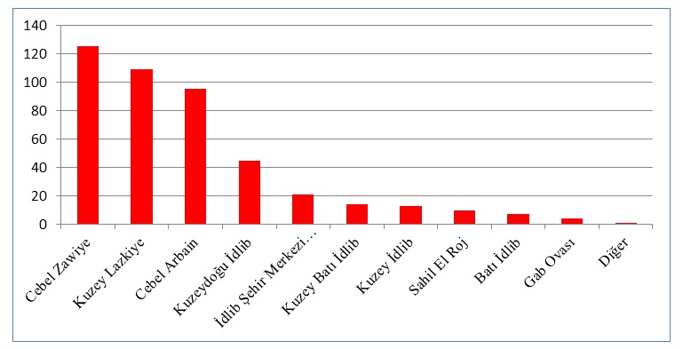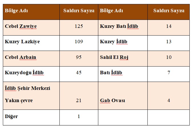 2021 yılı boyunca tüm İdlib bölgesinde en çok Rus hava saldırısına uğrayan bölgeler sırasıyla Cebel Zaviye, Kuzey Lazkiye, Cebel Arbain ve Kuzey Doğu İdlib’tir.