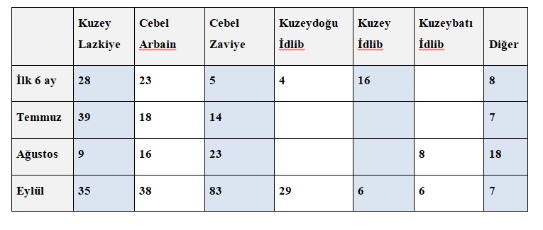 Ancak saldırıların bölgelere hangi dönemlerde dağıldığı da olan biteni anlamak için ayrı bir veri sunmaktadır. Aşağıdaki verilerden de anlaşılabileceği gibi Rusya yılın ilk altı ayı ve Temmuz’da saldırılarını büyük ölçüde Kuzey Lazkiye ve Cebel Arbain’e odaklarken (Kuzey İdlib saldırıları petrol ticaretine ilişkin çok kısa süreli bir olguydu) Ağustos ayı ile birlikte Rusya’nın odağının değiştiği görülmektedir. Bu tarihten itibaren Rusya yüzünü daha çok M4 karayolunun kontrolüne çevirmiş; bu nedenle Cebel Arbain ve Cebel Zaviye’ye odaklanmıştır. Eylül ayında ise odak büyük bir ölçüde Cebel Zaviye ve son günlerde Kuzey Doğu İdlib’e yöneldiği görülmektedir.