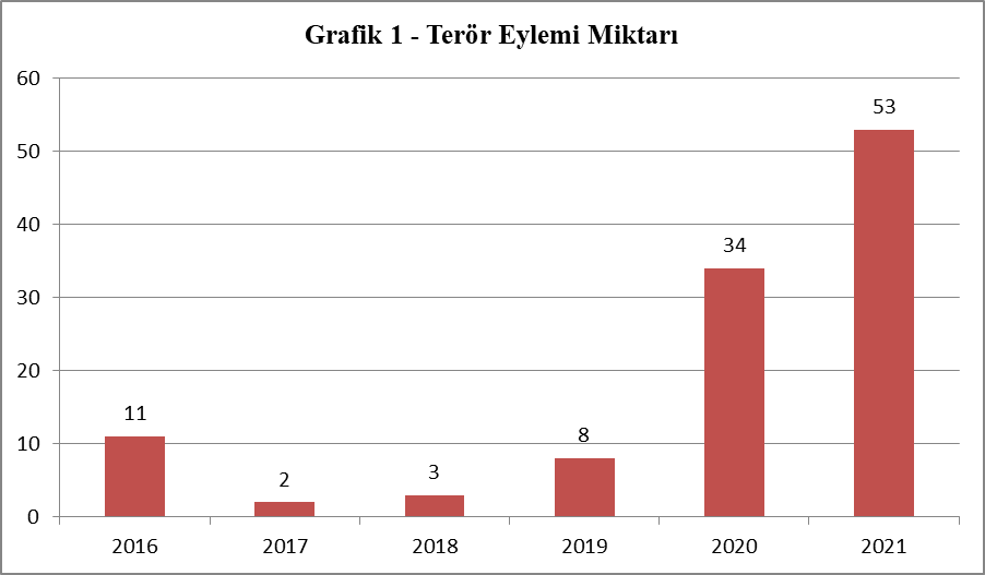 HBDH tarafından düzenlendiği iddia edilen ve örgütün internet sayfasında üstlenilen terör eylemleri incelendiğinde; 2016 yılında 11, 2017’de 2, 2018’de 3, 2019’da 8, 2020’de 34 ve 2021 yılının ilk beş ayında ise 53 terör eylemi (Grafik 1) olmak üzere toplam 111 eylem düzenlendiği görülmektedir.