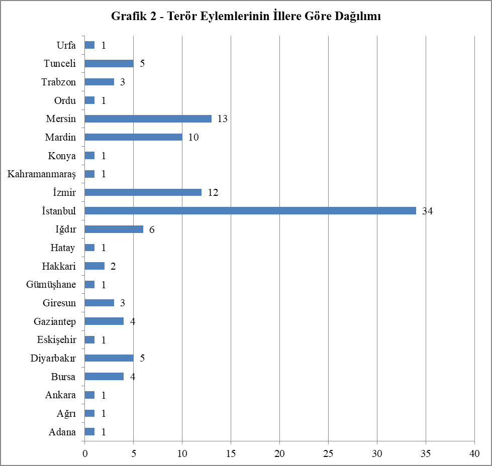 HBDH tarafından düzenlenen terör eylemlerinin illere göre dağılımı incelendiğinde (Grafik 2) eylemlerin 22 farklı ilde yoğunlaştığı anlaşılmaktadır. Bu iller içerisinde en fazla eylemin, İstanbul’da düzenlendiği görülmektedir. İstanbul’u, Mersin, İzmir ve Mardin illeri takip etmektedir. HBDH eylemlerinin illere göre dağılımına ilişkin veriler, örgütün terör eylemlerini şehirlere yayma arzusu içerisinde bulunduğunu, şehirlerde eylem yapma imkan ve kabiliyetini artırmaya çalıştığını işaret etmektedir.