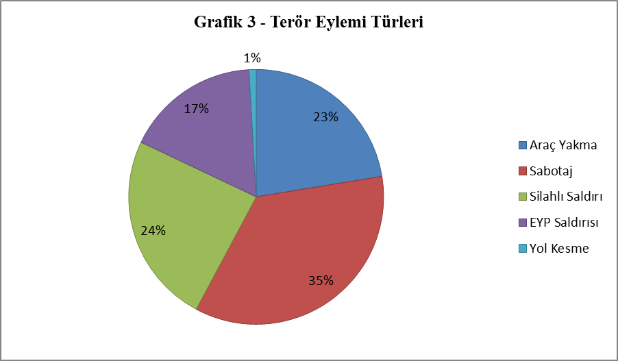 HBDH terör örgütünün 2016 yılından bugüne düzenlediği eylemlerin eylem türleri incelendiğinde ise (Grafik 3) en fazla düzenlenen eylem yönteminin sabotaj türü eylemler olduğu, bu eylem türünü silahlı saldırı ve araç yakma eylemlerinin izlediği görülmektedir.